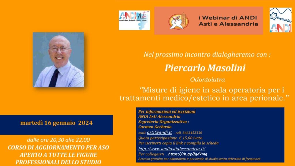 Si terrà martedì 16 gennaio, dalle ore 20.30 alle 22.00, il primo webinar del 2024 organizzato da ANDI Asti ed ANDI Alessandria, corso di aggiornamento per ASO, aperto a tutte le figure professionali dello studio odontoiatrico.