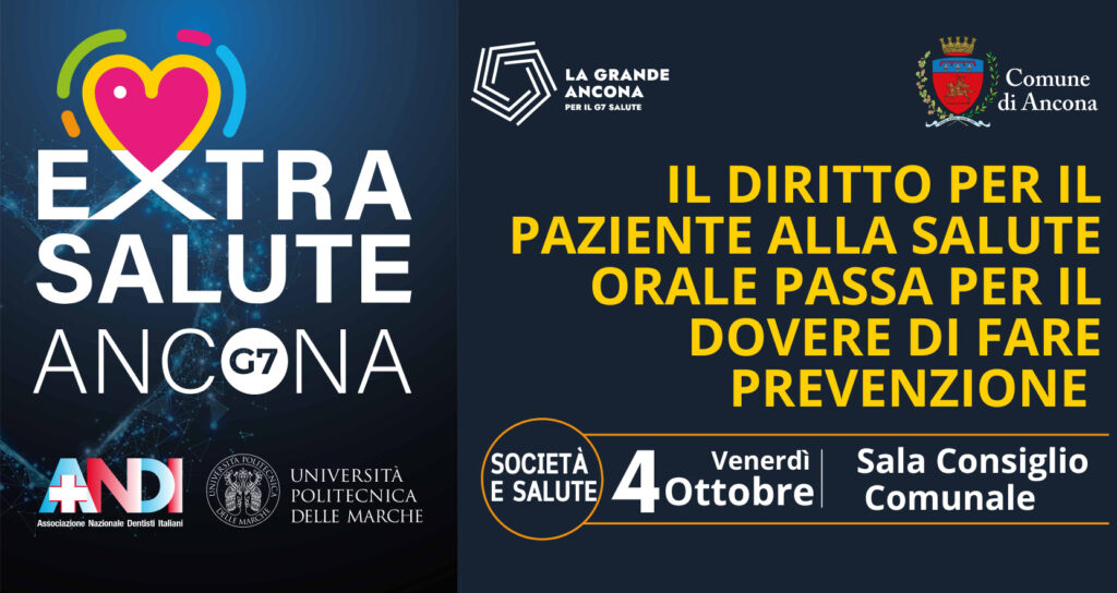 Nel quadro del calendario definito per le giornate precedenti e susseguenti gli incontri istituzionali tra le rappresentanze dei vari Ministeri della Salute dei paesi aderenti al G7, si svolgerà, venerdì 4 ottobre ad Ancona, presso la Sala del Consiglio Comunale, l’Extra G7 Salute, dal titolo “Il diritto per il paziente alla salute orale passa per il dovere di fare prevenzione”. Un cartellone ricco di eventi che vede la partecipazione di ANDI e Fondazione ANDI ETS in collaborazione con l’Università Politecnica delle Marche
